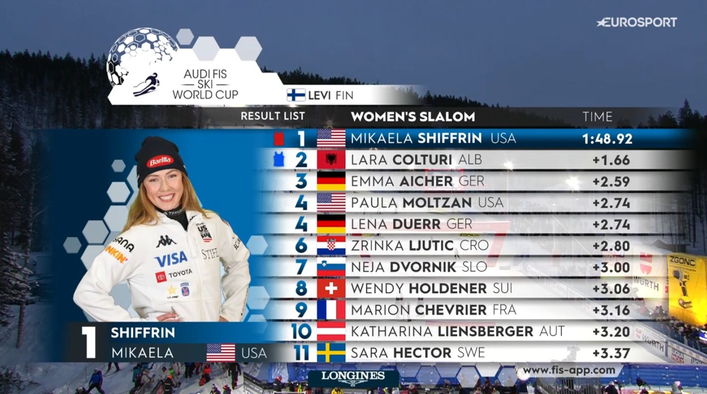 Seit Tina Maze (SLO) 2014 den Slalom in Levi gewann, wurden die letzten 14 Rennen in Finnisch-Lappland entweder von Shiffrin (acht, ihr weiterer Sieg stammt aus dem Jahr 2013) oder Petra Vlhova (SVK/Rossignol, sechs) gewonnen. Da Vlhova am Samstag aufgrund ihrer langen Genesungsphase nach einer Verletzung nicht dabei war, war Shiffrin in beiden Läufen konkurrenzlos.