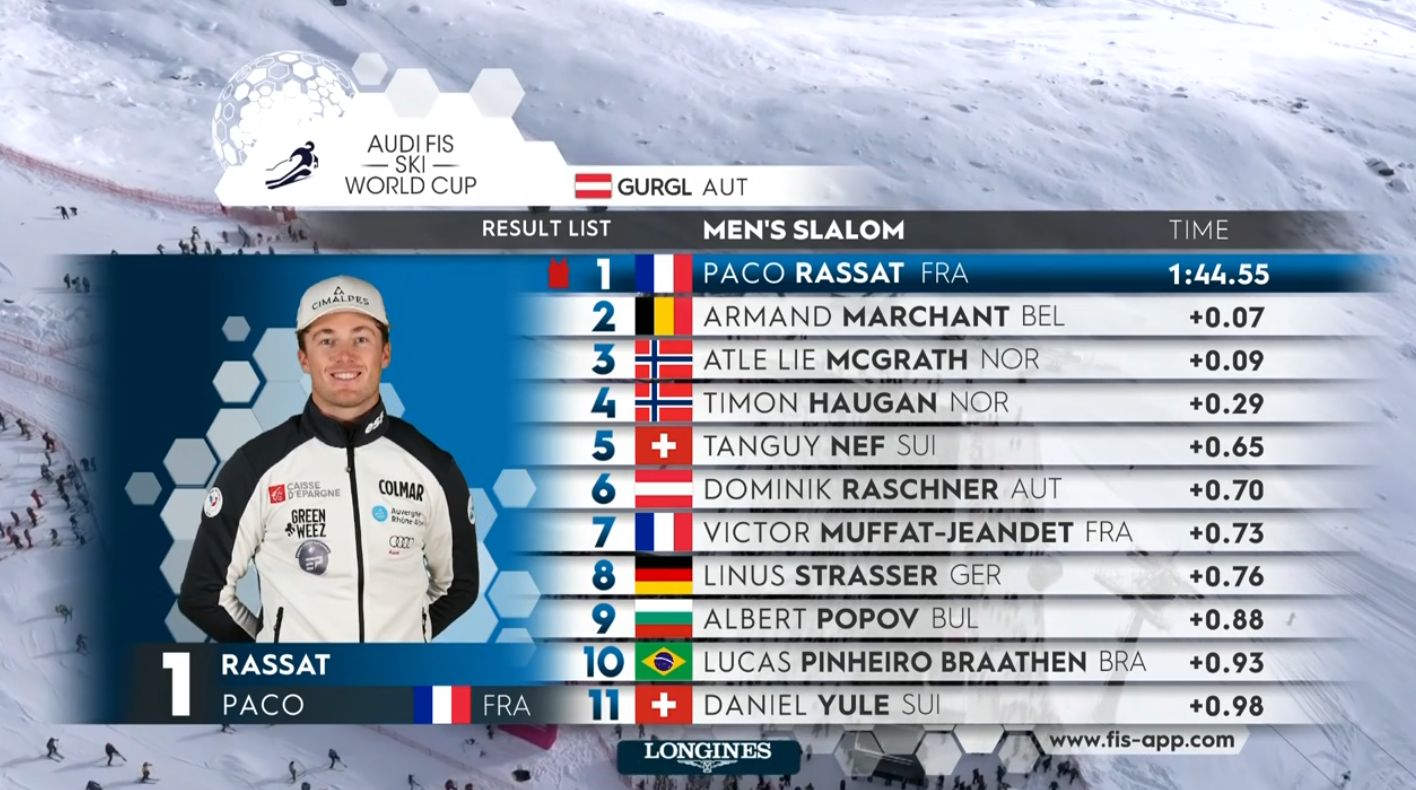 Der Franzose lag in seinem ersten Lauf auf der österreichischen Piste auf Platz 14, 0,85 Sekunden hinter dem Führenden Atle Lie McGrath (NOR/Head), der schließlich Dritter wurde (+0,09). Doch erst Rassats temporeicher zweiter Lauf, genau wie in der Vorwoche, katapultierte ihn in der Gesamtwertung nach oben.