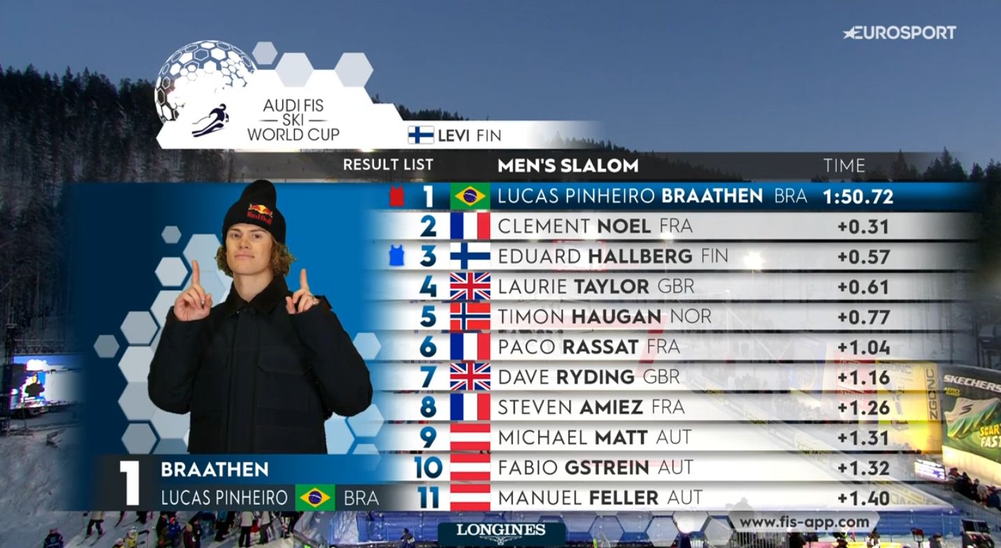 Lucas Pinheiro Braathen (Atomic) hat es geschafft. Am Sonntag schrieb der 25-Jährige unter Flutlicht in Lappland Geschichte, indem er als erster brasilianischer Skirennläufer überhaupt einen Podestplatz im Audi FIS Weltcup erreichte.