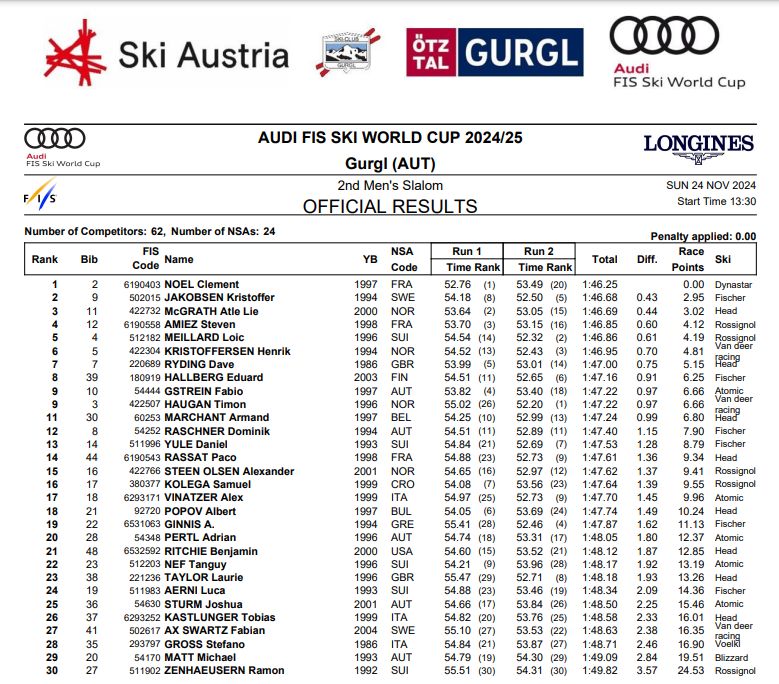 Gestern fand im österreichischen Gurgl der zweite Slalom der Herren in der Saison 2024 / 2025 statt. Wie schon beim ersten Slalom im finnischen Levi, war der großgewachsene Franzose Clément Noël nicht zu schlagen!